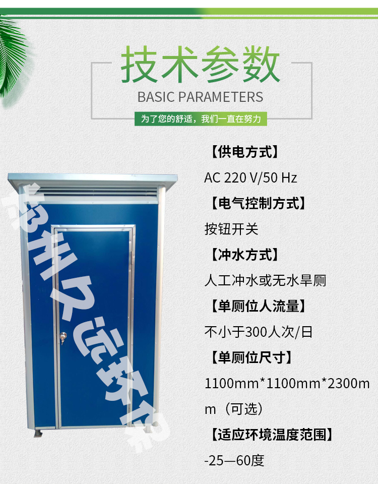 移動廁所不受任何工作環境的限制,外形結構輕巧,顏色搭配合理。 適用于一般城市街道、旅游景區、公園綠化、車站、碼頭、生活小區、建筑工地、廣場等人口密集的公共場所及繁華商業街等場所。 移動洗手間具有可移動性、方便運輸、安裝簡單等優點。 移動廁所水沖式內部配置: 蹲便器、沖水箱、洗手池、排風扇、照明開關、...